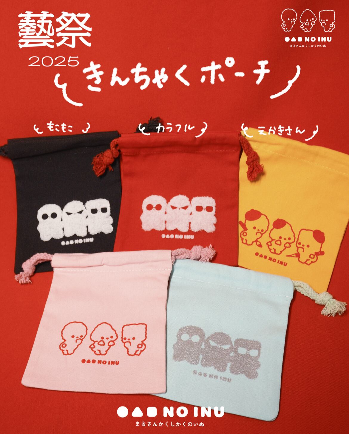 まるさんかくしかくのいぬの3種類のデザイン5colorのきんちゃくで、小物やリップなどの化粧品、常備薬、おやつを入れて持ち歩くのにちょうど良いサイズです。