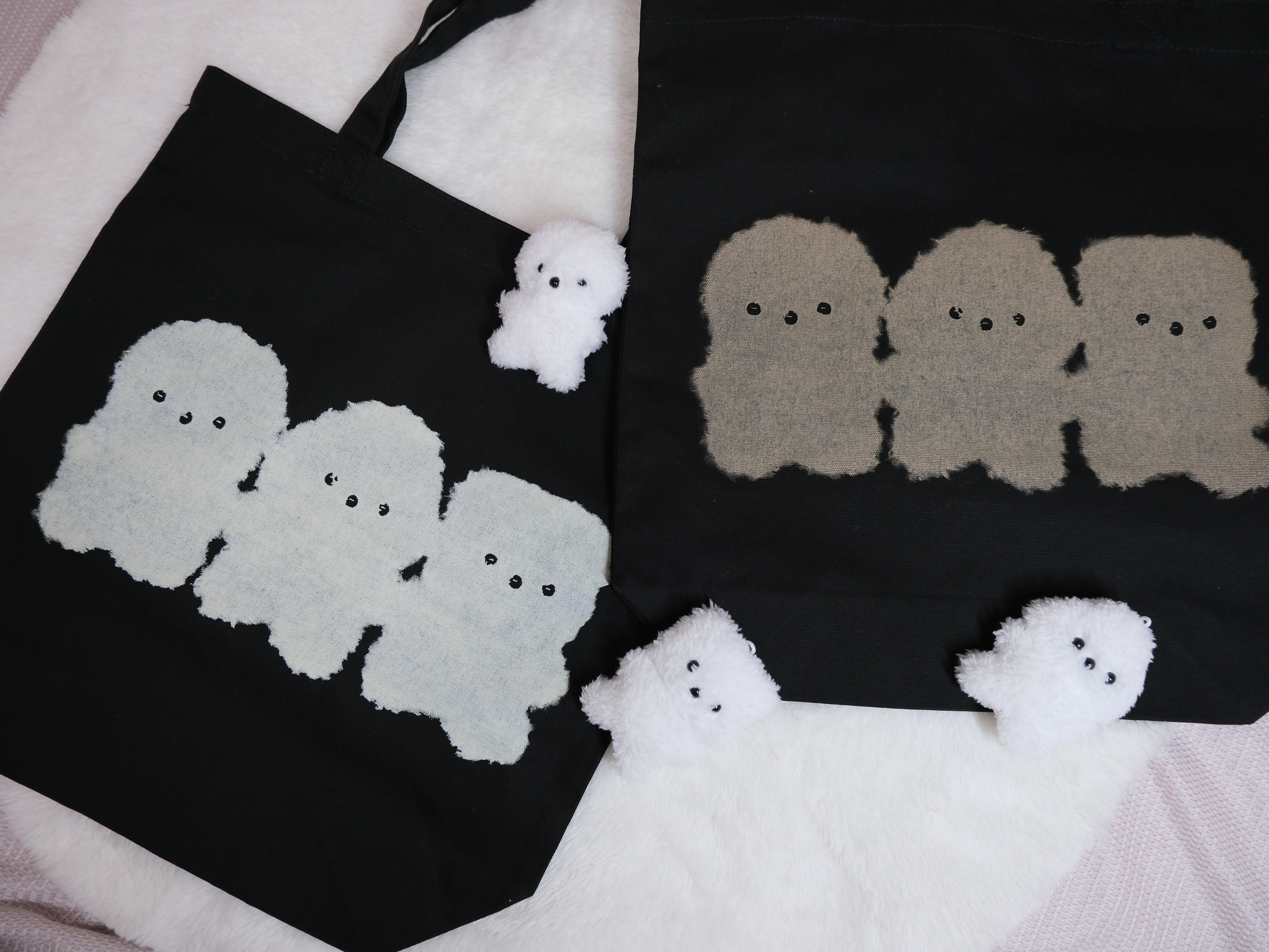 ブラックキャンバスにココアカラーで○△□ NO INU が3匹並んだトートバッグです!